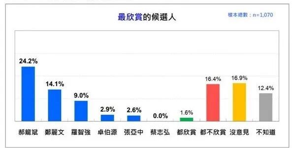 而在“除了上述人选外,您还欣赏哪一位?(单选)”问题的结果发现:罗智强以22%拔得头筹,郑丽文以17.3%居次,郝龙斌11.6%落居第三,其他依序是7.9%卓伯源,7.4%张亚中,1.3%蔡志弘。